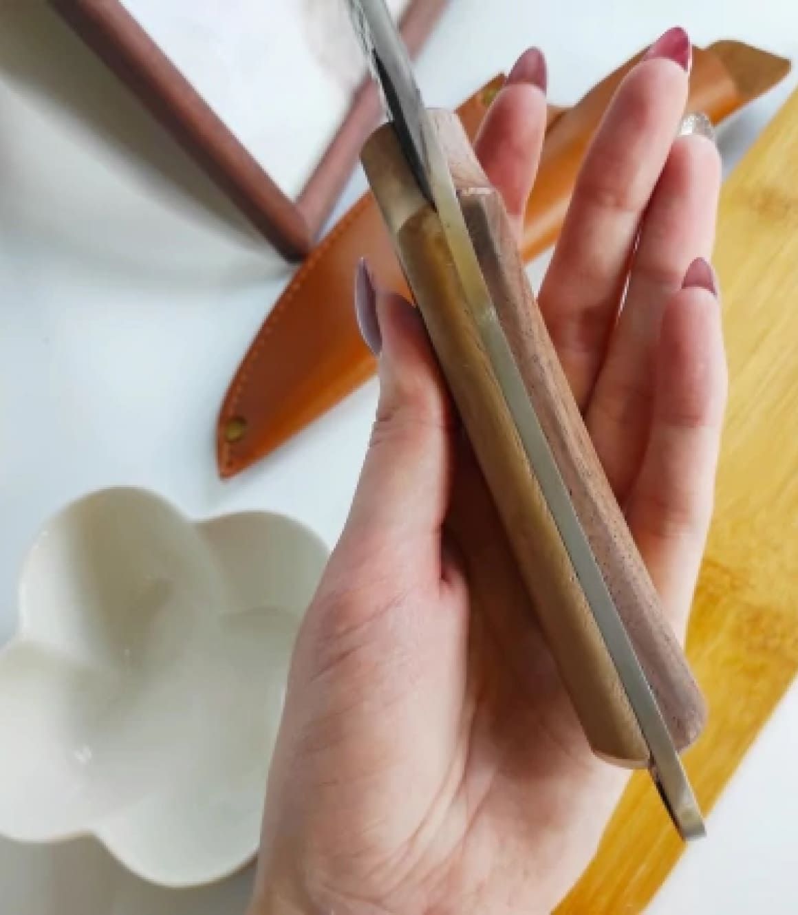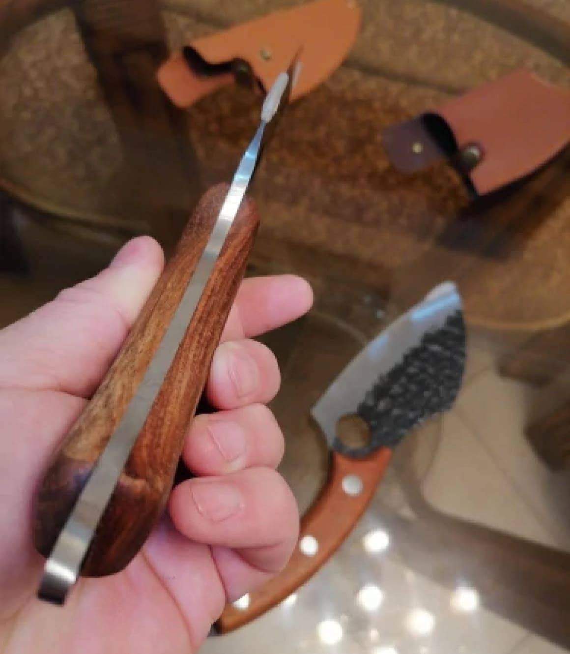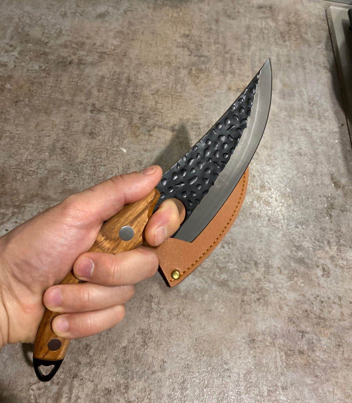 這是一款很棒的產品,設計非常符合人體工程學,是一把好刀,感覺堅固耐用。它的設計有利於良好的抓握力並安全地放在您的手掌中。它輕到可以切蔬菜,重到可以切肉。它的重量非常合適。工藝和設計都非常棒,強烈推薦。